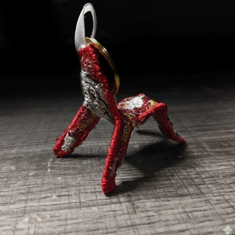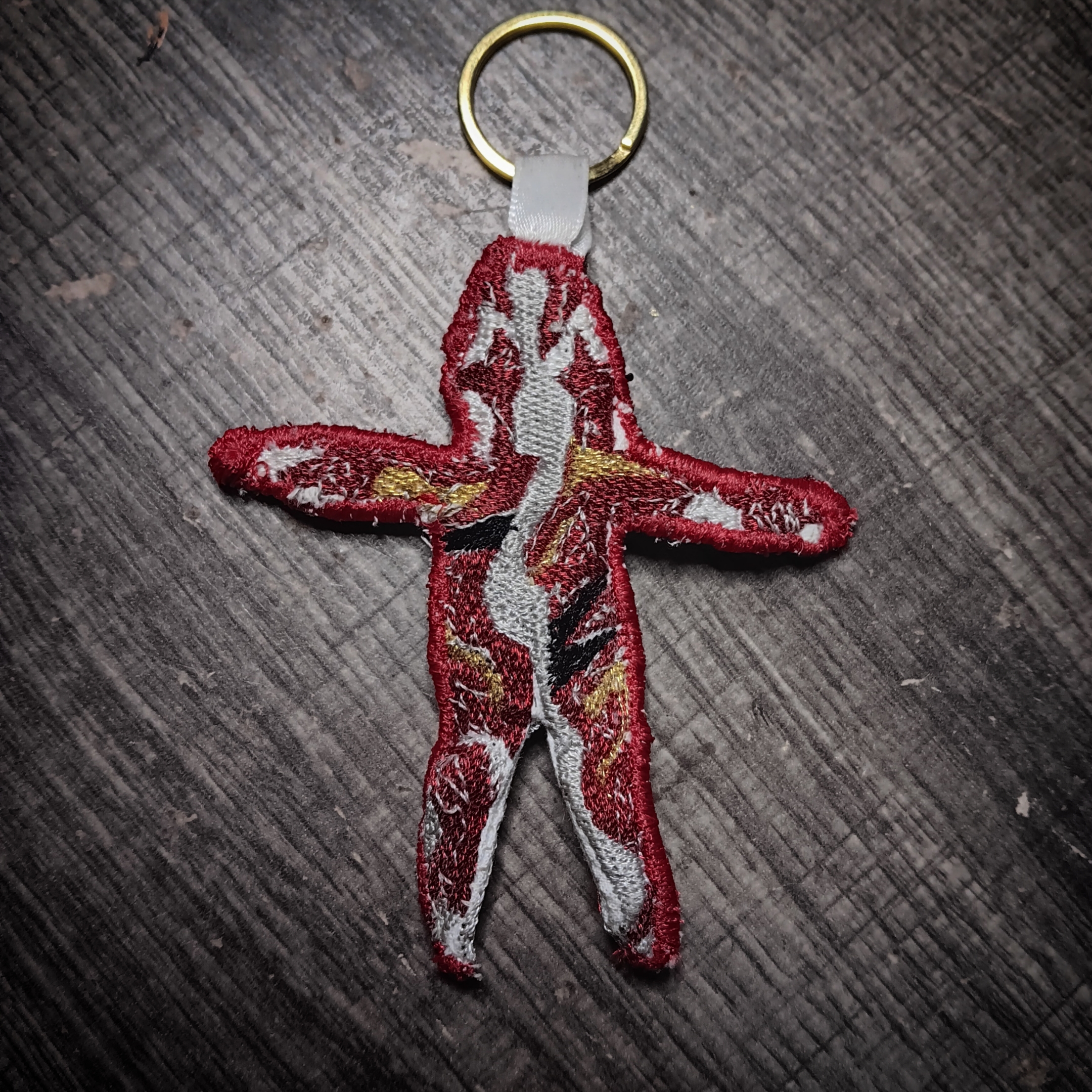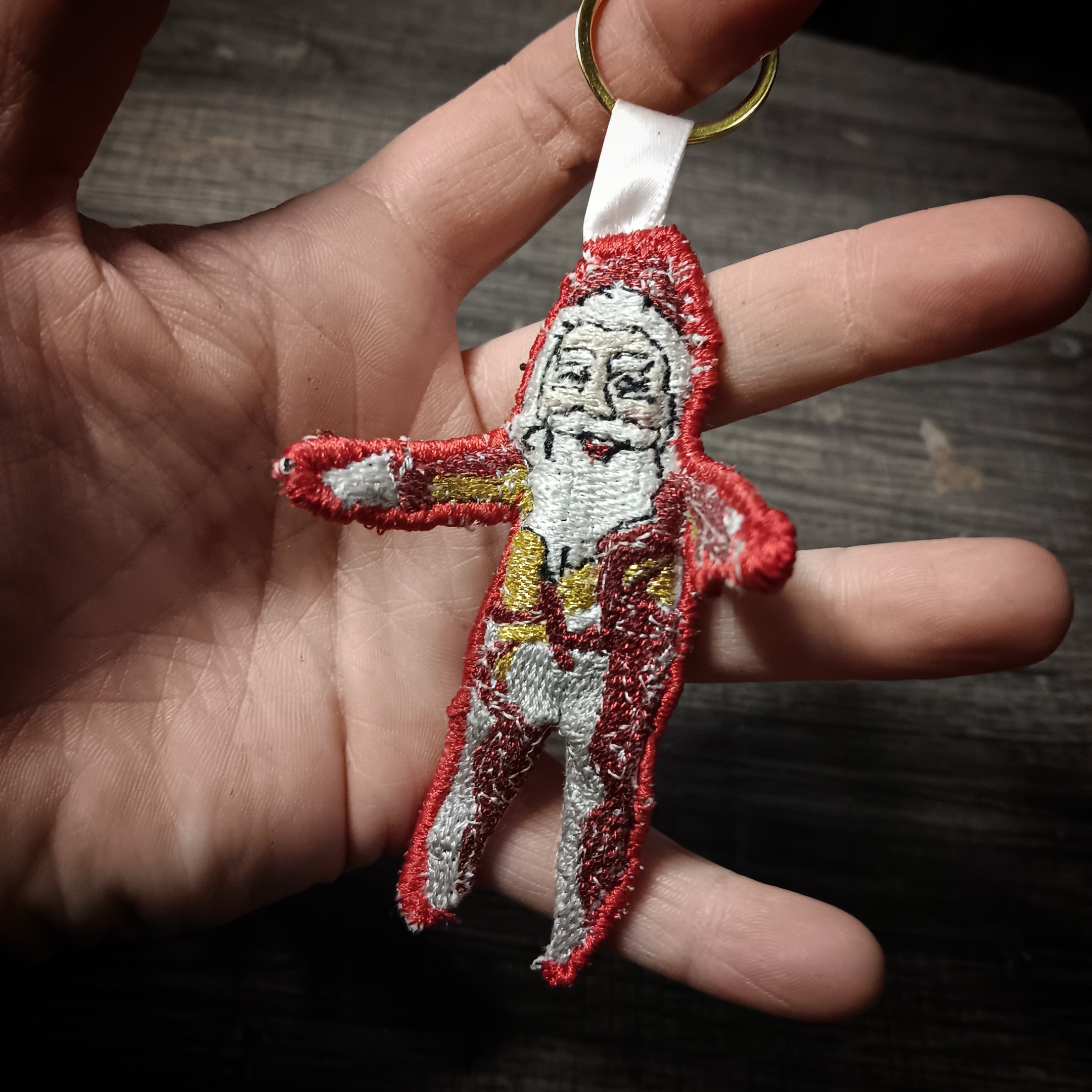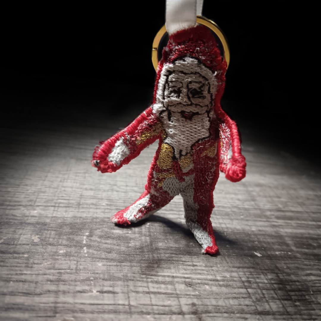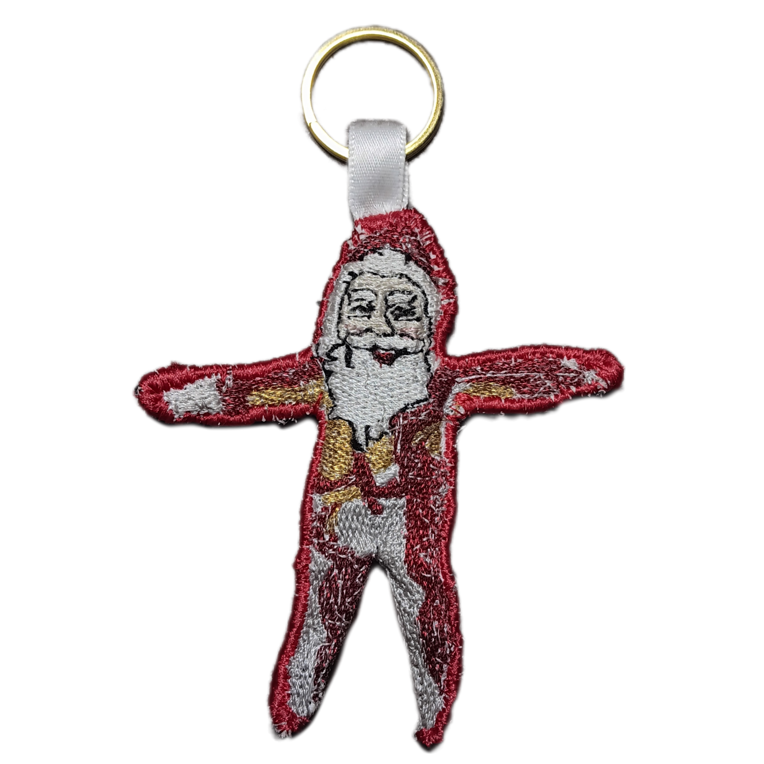 keep gugugaga santa close at hand at all times with this posable embroidered keychain. With a proper gold and metallic red thread for authentic foil appearance