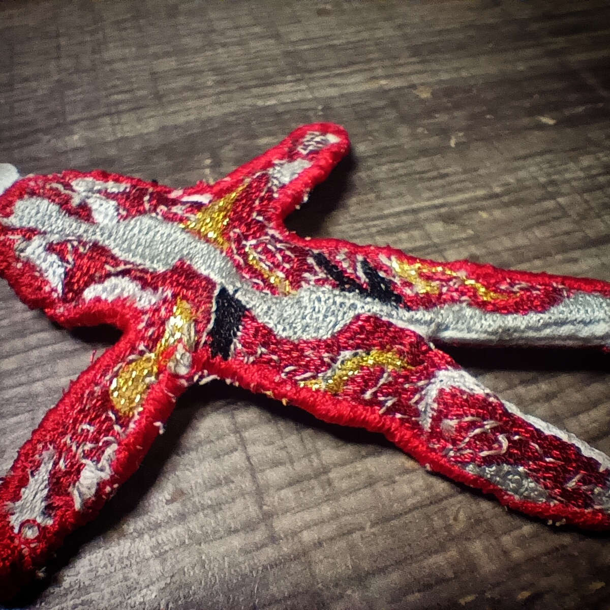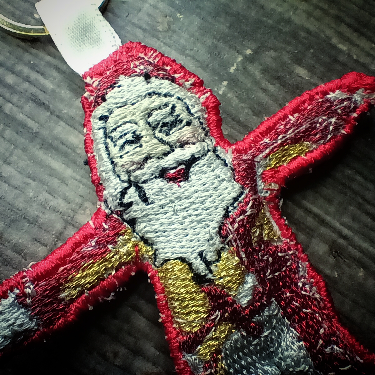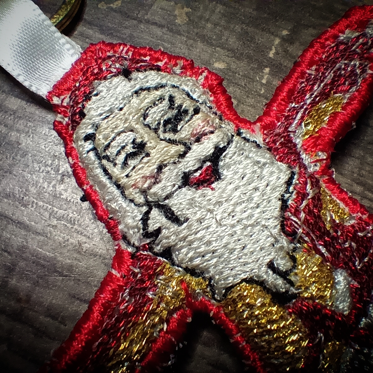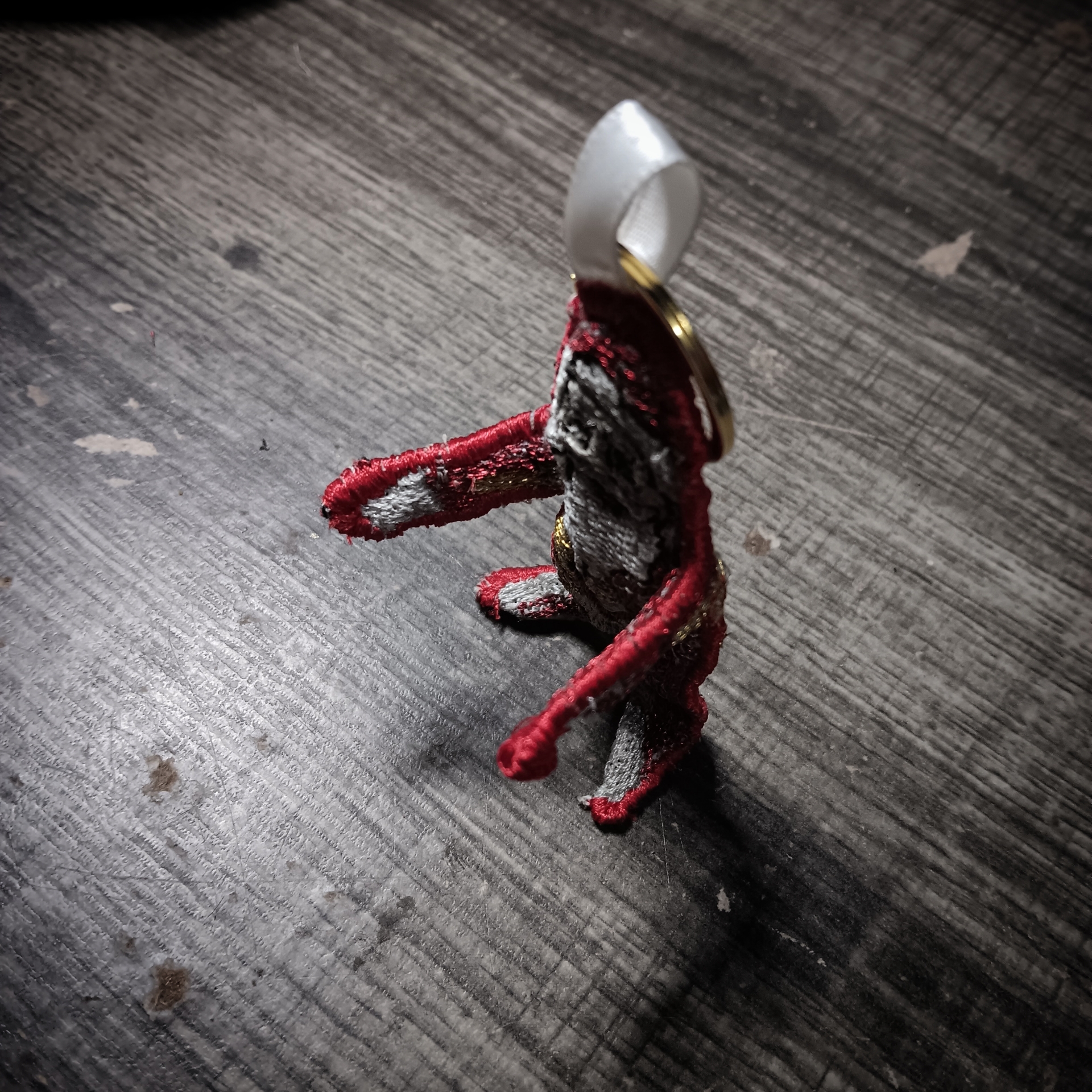 keep gugugaga santa close at hand at all times with this posable embroidered keychain. With a proper gold and metallic red thread for authentic foil appearance