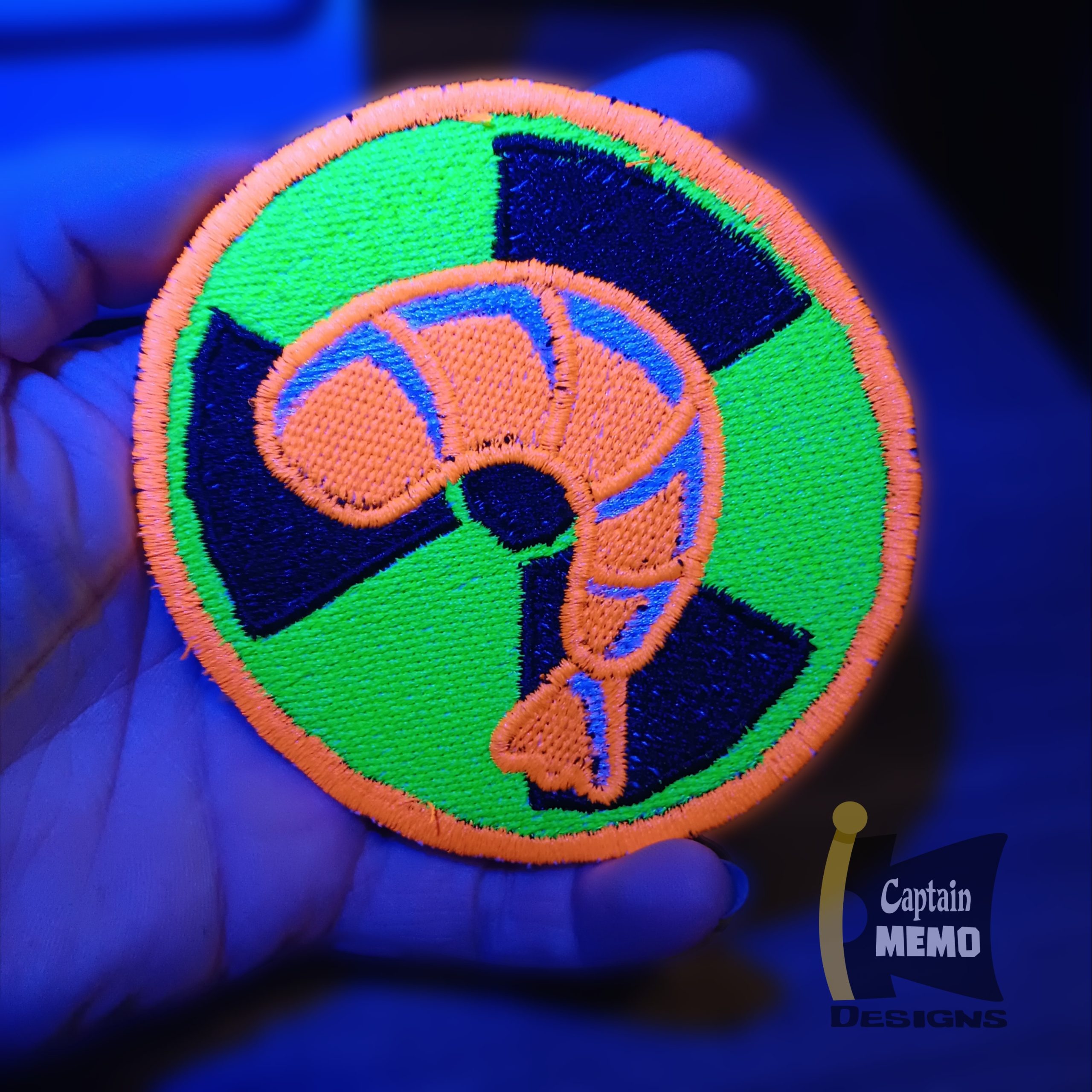 Shiney polyester thread on stiff cotton denim. High vis NEON color glows under black light (does not Glow in the dark)